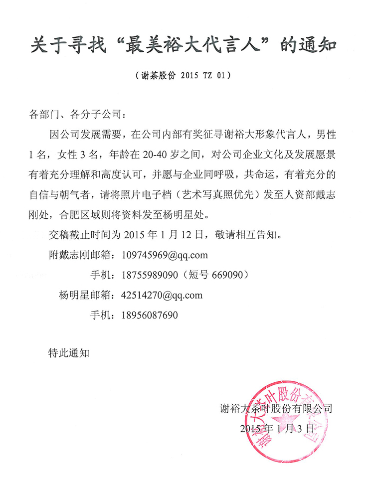 因公司發(fā)展需要,在公司內(nèi)部有獎?wù)鲗ぶx裕大形象代言人,男性1名,女性3名,年齡在20-40歲之間,對公司企業(yè)文化及發(fā)展愿景有著充分理解和高度認(rèn)可,并愿與企業(yè)同呼吸,共命運(yùn),有著充分的自信與朝氣者,請將照片電子檔(藝術(shù)寫真照優(yōu)先)發(fā)至人資部戴志剛處,合肥區(qū)域則將資料發(fā)至楊明星處。