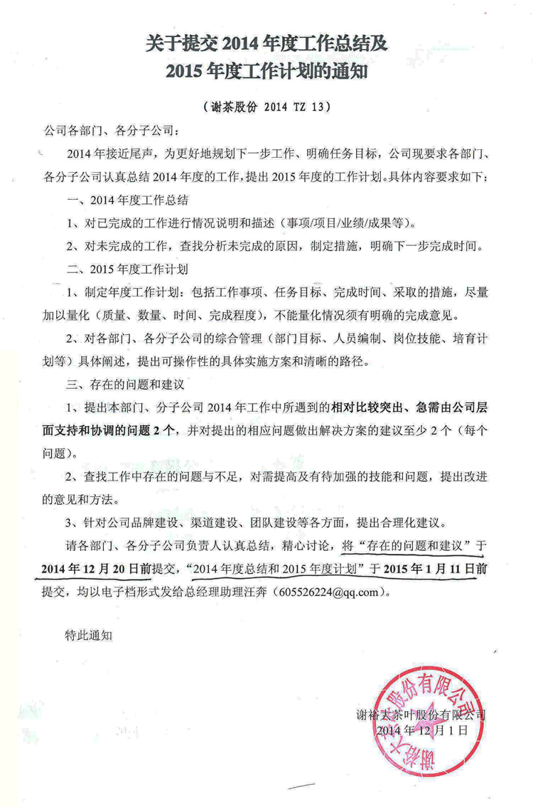 請各部門、各分子公司負(fù)責(zé)人認(rèn)真總結(jié),精心討論,將“存在的問題和建議”于2014年12月20日前提交,“2014年度總結(jié)和2015年度計(jì)劃”于2015年1月11日前提交,均以電子檔形式發(fā)給總經(jīng)理助理汪奔([email protected])。