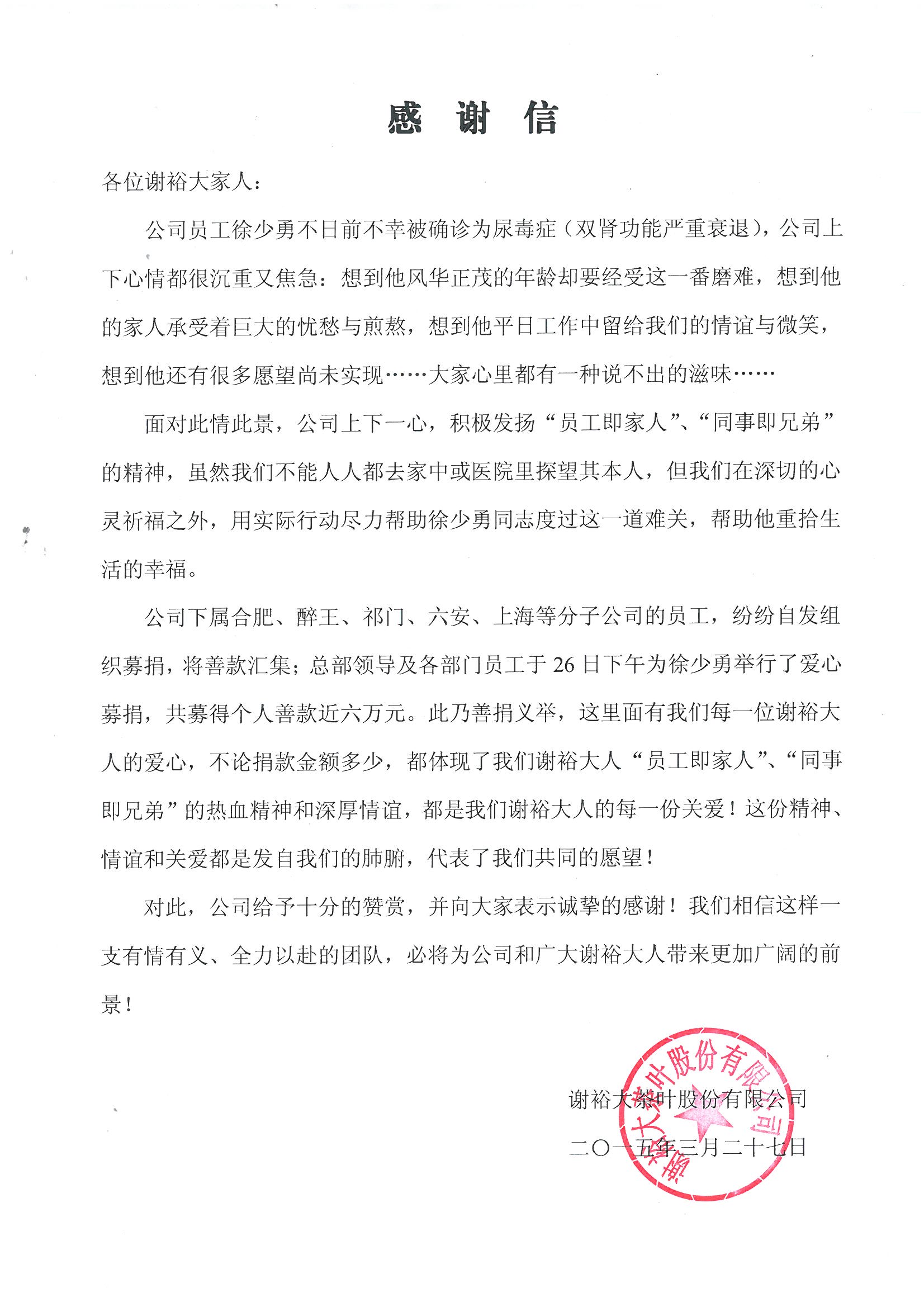 本次愛心募捐活動彰顯了謝裕大一家人的相互關心、幫助和“企業(yè)有大愛”的正能量,共收到個人善款近六萬元。