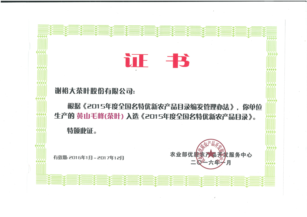 近日,國家農(nóng)業(yè)部官網(wǎng)正式發(fā)布《2015年度全國名特優(yōu)新農(nóng)產(chǎn)品目錄》,包括了糧油、蔬菜、果品、茶葉及其他5大類741個產(chǎn)品,有效期自2016年1月至2017年12月,兩年一評。其中,謝裕大出品的黃山毛峰和六安瓜片雙雙入選。
