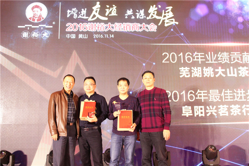 最后,在精心安排的晚宴現(xiàn)場(chǎng),謝裕大董事長(zhǎng)謝一平、總經(jīng)理?xiàng)盍x云現(xiàn)場(chǎng)頒發(fā)了2016年業(yè)績(jī)貢獻(xiàn)獎(jiǎng)和最佳進(jìn)步獎(jiǎng),來(lái)自蕪湖姚大山茶業(yè)有限公司的姚學(xué)沖先生、阜陽(yáng)興茗茶行的張健先生分別獲得殊榮。晚宴現(xiàn)場(chǎng)高朋滿座,歡歌笑語(yǔ),大家賓至如歸,熱鬧非凡,微信抽獎(jiǎng)與即時(shí)點(diǎn)歌活動(dòng)更是把現(xiàn)場(chǎng)氣氛一次次推向高潮。