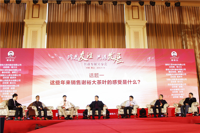 在接下來(lái)的“共謀發(fā)展分享會(huì)”上,謝裕大總經(jīng)理?xiàng)盍x云、副總經(jīng)理謝明之邀請(qǐng)了六位與謝裕大合作已久的杰出經(jīng)銷商代表上臺(tái)就“多年來(lái)銷售謝裕大茶葉的感受”和“徽茶的未來(lái)發(fā)展方向”等話題進(jìn)行共同探討,與各位新老經(jīng)銷商朋友們分享了自己的看法并給出了建議。各位老經(jīng)銷商朋友們分別侃侃而談,將自己多年的銷售心得慷慨分享,贏得經(jīng)銷商代表們的一致好評(píng)。
