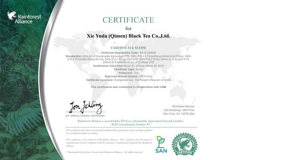 謝裕大(祁門)紅茶有限公司由謝裕大茶葉股份有限公司投資1.2億元興建于2013年建成并投產(chǎn),位于“中國紅茶之鄉(xiāng)”——安徽祁門縣經(jīng)濟開發(fā)區(qū)綠色產(chǎn)業(yè)園。公司占地60畝,建有一萬五千多平方米的紅茶初精制車間、員工公寓和辦公樓、產(chǎn)品展示和物流中心;建有領(lǐng)先的智能化清潔化紅茶生產(chǎn)線;擁有由可持續(xù)農(nóng)業(yè)發(fā)展網(wǎng)絡(luò)認證機構(gòu)頒發(fā)的國際可持續(xù)農(nóng)場(雨林聯(lián)盟)認證的茶園千余畝,認證證書注冊號碼:RA-G-009024。