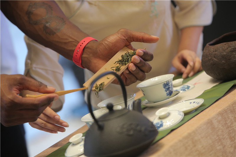 來到安徽,怎么能不品嘗一下謝裕大的好茶,“魔獸”霍華德在謝裕大展位里,經(jīng)美女茶藝師調(diào)教,親手沖泡了一壺黃山毛峰茶,期間,還發(fā)生了幾件令人忍俊不禁的小插曲。霍華德2米11的壯碩體格甚是可觀,功夫茶杯和茶壺在他的魁梧身材的反襯下顯得更加?jì)尚×岘??!按蟆迸c“小”的反差組合,有趣的畫面構(gòu)圖,這個(gè)來自美國的籃球“魔獸”,居然與中國茶毫無違和的相配。