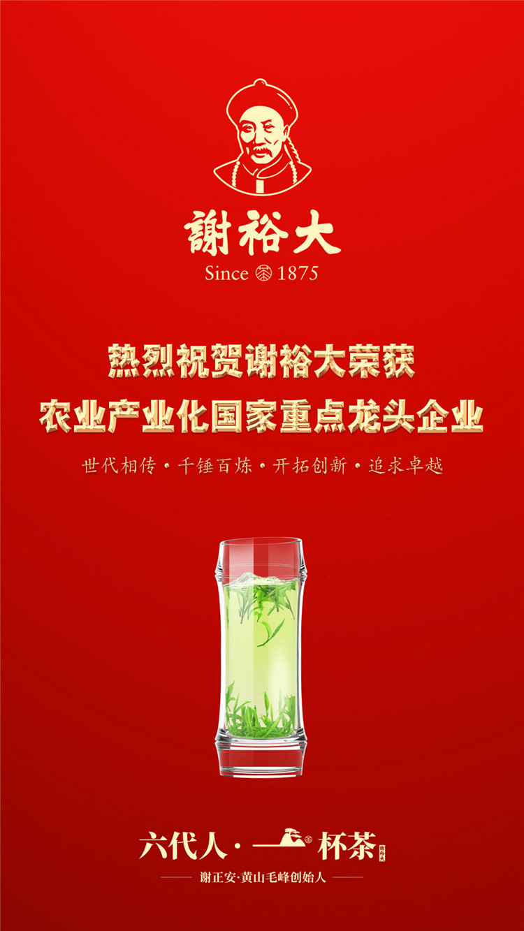2018年謝裕大可謂喜事連連,本次榮獲“農(nóng)業(yè)產(chǎn)業(yè)化國(guó)家重點(diǎn)龍頭企業(yè)”是今年繼謝裕大再次通過(guò)“高新技術(shù)企業(yè)認(rèn)定”,榮獲“2018中國(guó)茶業(yè)最受消費(fèi)者認(rèn)可十強(qiáng)企業(yè)”、 “2018年度安徽名牌”、 “安徽省誠(chéng)信計(jì)量示范AAA級(jí)單位”“安徽省企業(yè)標(biāo)準(zhǔn)化良好行為AAA級(jí)示范企業(yè)”、“2017年度省認(rèn)定企業(yè)技術(shù)中心認(rèn)定”,董事長(zhǎng)謝一平入選首批 “中國(guó)制茶大師”等榮譽(yù)后獲得的又一殊榮!