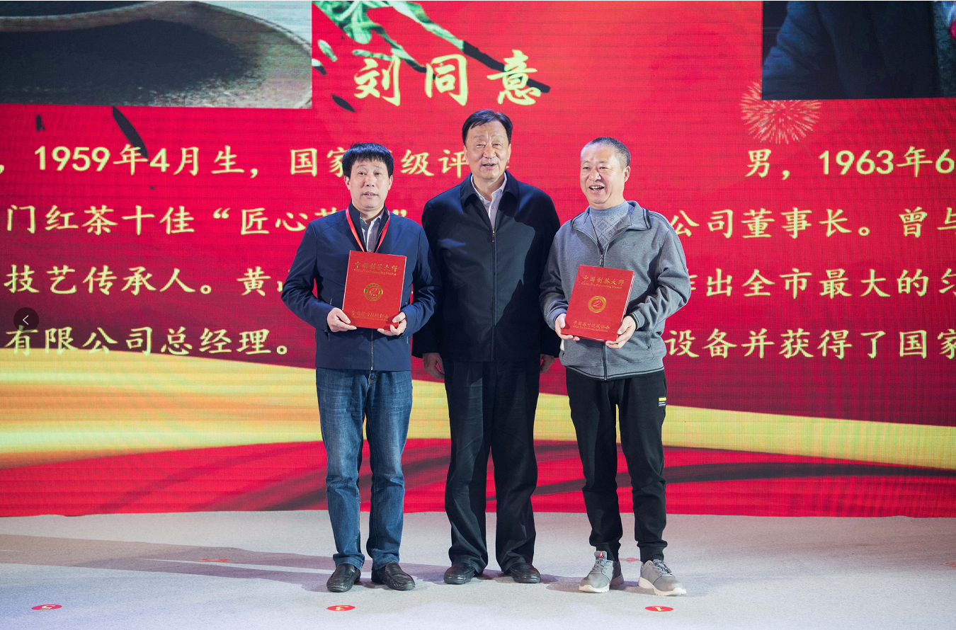 中國(guó)茶葉流通協(xié)會(huì)會(huì)長(zhǎng)王慶(中)為制茶大師第二批(紅茶類(lèi))黃山市獲獎(jiǎng)?wù)哳C獎(jiǎng)