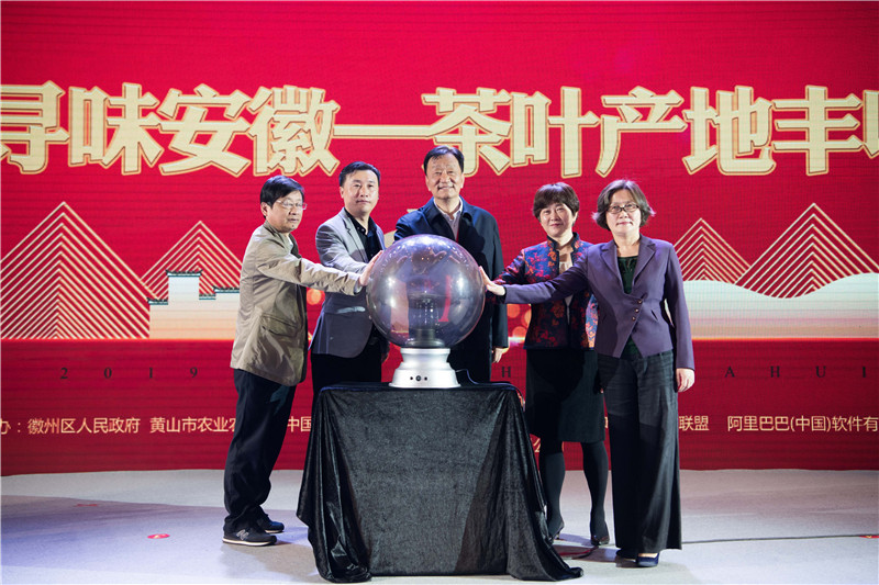 (從左至右:黃山市農(nóng)業(yè)農(nóng)村局局長(zhǎng) 王武、阿里巴巴集團(tuán)農(nóng)業(yè)發(fā)展部總監(jiān) 姜思敏、中國(guó)茶葉流通協(xié)會(huì)會(huì)長(zhǎng) 王慶、黃山市人民政府副市長(zhǎng) 程紅、徽州區(qū)人民政府區(qū)長(zhǎng) 張偉)