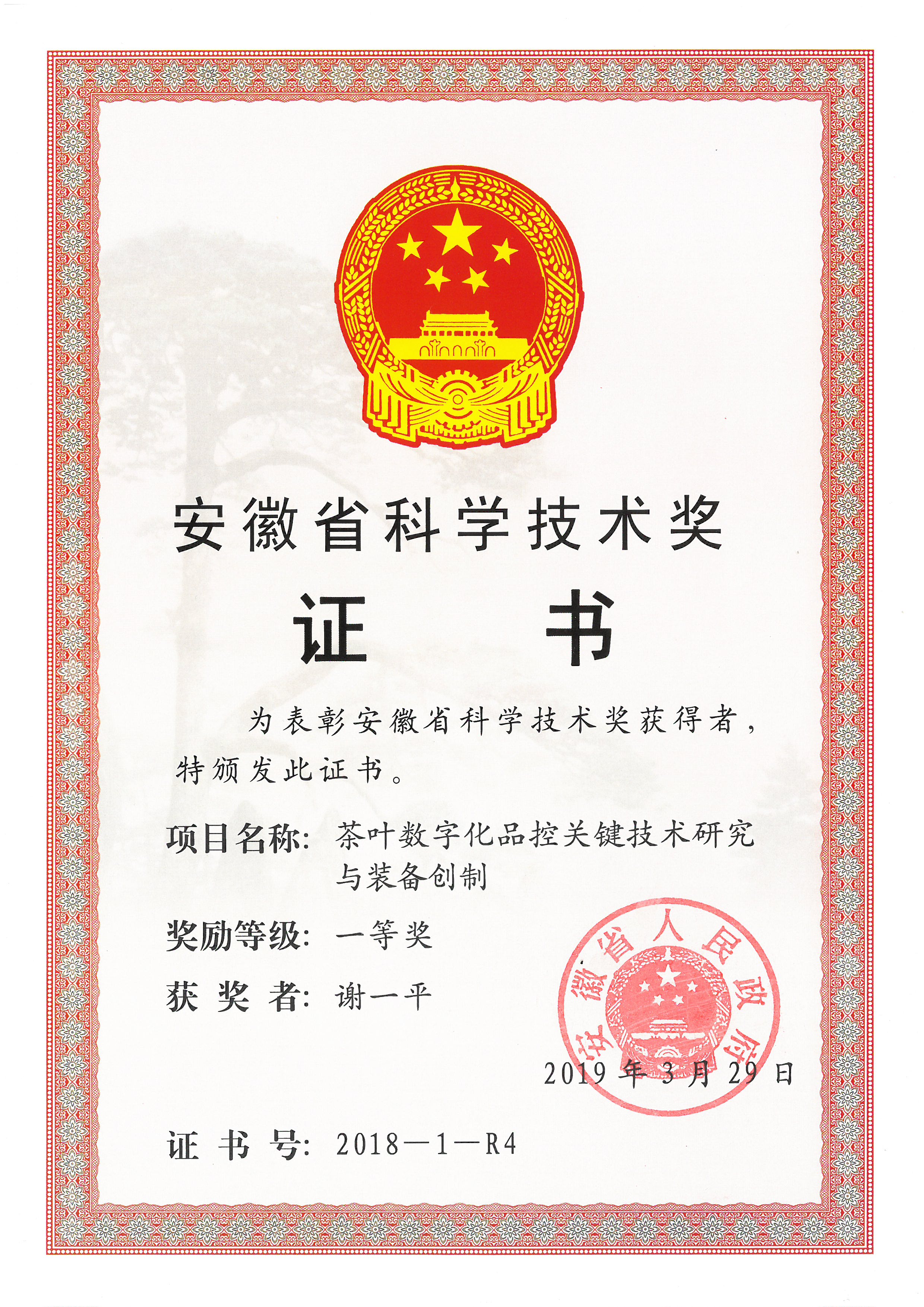 謝裕大與安徽農(nóng)業(yè)大學(xué)為產(chǎn)學(xué)研合作單位,謝裕大作為“茶葉數(shù)字化品控關(guān)鍵技術(shù)研究與裝備創(chuàng)制”項(xiàng)目的共同完成單位被評(píng)為省科技進(jìn)步獎(jiǎng)一等獎(jiǎng),董事長(zhǎng)謝一平作為共同完成人,獲得省科技進(jìn)步獎(jiǎng)一等獎(jiǎng)個(gè)人認(rèn)證。