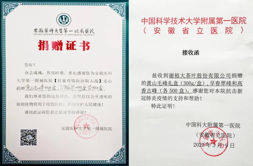 疫情爆發(fā)后,從武漢到全國(guó),無(wú)數(shù)醫(yī)務(wù)人員堅(jiān)守、奮斗在疫情阻擊戰(zhàn)第一線,成為了中國(guó)最美“逆行者”,他們的身心健康一直牽掛著全國(guó)人民的心。3月8-9日,謝裕大茶葉股份有限公司將兩批共400箱總價(jià)值60余萬(wàn)元的愛(ài)心茶分別捐贈(zèng)給安徽醫(yī)科大學(xué)第一附屬醫(yī)院和中國(guó)科學(xué)技術(shù)大學(xué)第一附屬醫(yī)院,致敬奮戰(zhàn)在抗疫一線的白衣戰(zhàn)士!