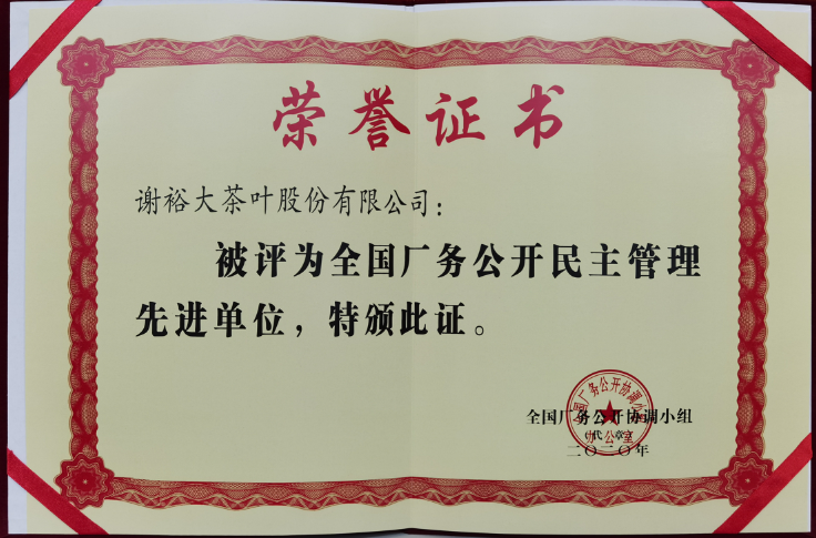 “全國廠務(wù)公開民主管理工作先進(jìn)單位”3年評(píng)選表彰一次,謝裕大為黃山市唯一一家榮獲本次表彰的企業(yè)。這是謝裕大近年來在企業(yè)民主管理方面獲得的最高榮譽(yù),同時(shí)標(biāo)志著謝裕大廠務(wù)公開民主管理工作再次取得實(shí)質(zhì)性成果。