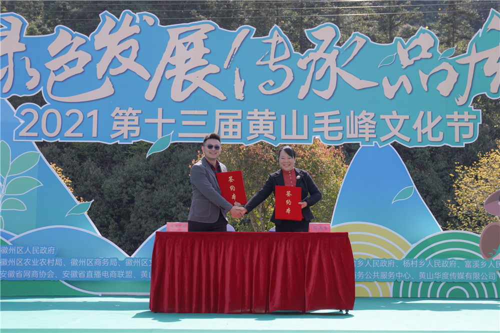 黃山市青年企業(yè)家代表葉昕(左)與富溪鄉(xiāng)政府簽署戰(zhàn)略合作協(xié)議