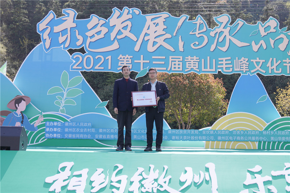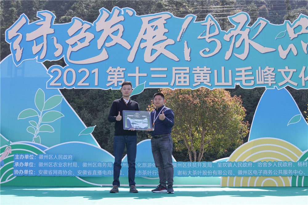今年天貓春茶山河行活動(dòng)再次來(lái)到黃山毛峰文化節(jié)的活動(dòng)現(xiàn)場(chǎng),連接源頭好茶,為本屆文化節(jié)添助力。在活動(dòng)現(xiàn)場(chǎng),阿里巴巴天貓茶行業(yè)負(fù)責(zé)人兆濂向謝裕大品牌第六代傳人謝明之頒發(fā)了天貓春茶十大匠人之黃山毛峰匠人獎(jiǎng)牌,并共同開(kāi)啟天貓春茶山河行黃山站線上活動(dòng)。