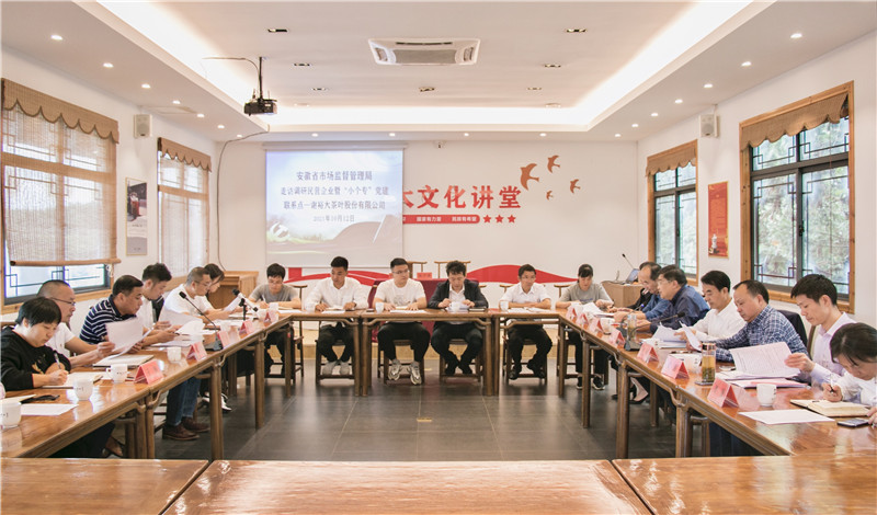 10月12日,安徽省市場監(jiān)督管理局(以下簡稱“市監(jiān)局”)黨組成員、副局長楊燚攜食品生產(chǎn)處長、黨支部書記張斌、副處長張強等一行赴謝裕大開展民營企業(yè)和“小個?!秉h建聯(lián)系點的走訪調(diào)研活動,黃山市市監(jiān)局局長李煒、副局長王文武,徽州區(qū)人民政府副區(qū)長張強,區(qū)市監(jiān)局副局長胡利順、王梅等領導全程共同參加。