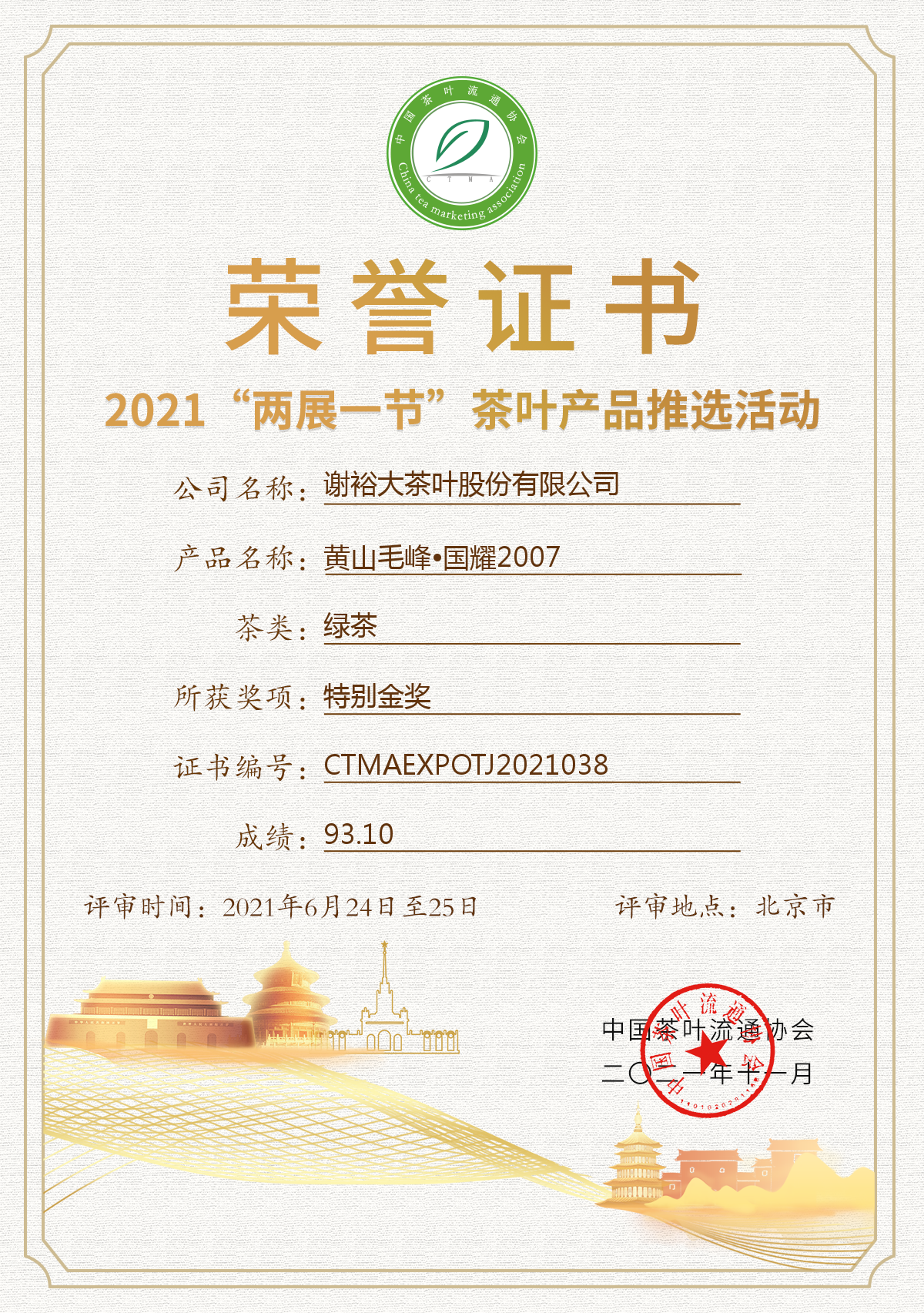 2021年“兩展一節(jié)”茶葉產(chǎn)品推選于6月24日至25日在北京成功舉辦,謝裕大“黃山毛峰·國耀2007”從117家參展企業(yè)選送的207個(gè)有效茶葉樣品中脫穎而出,榮獲2021“兩屆一展”茶葉產(chǎn)品推選活動(dòng)“特別金獎(jiǎng)”。