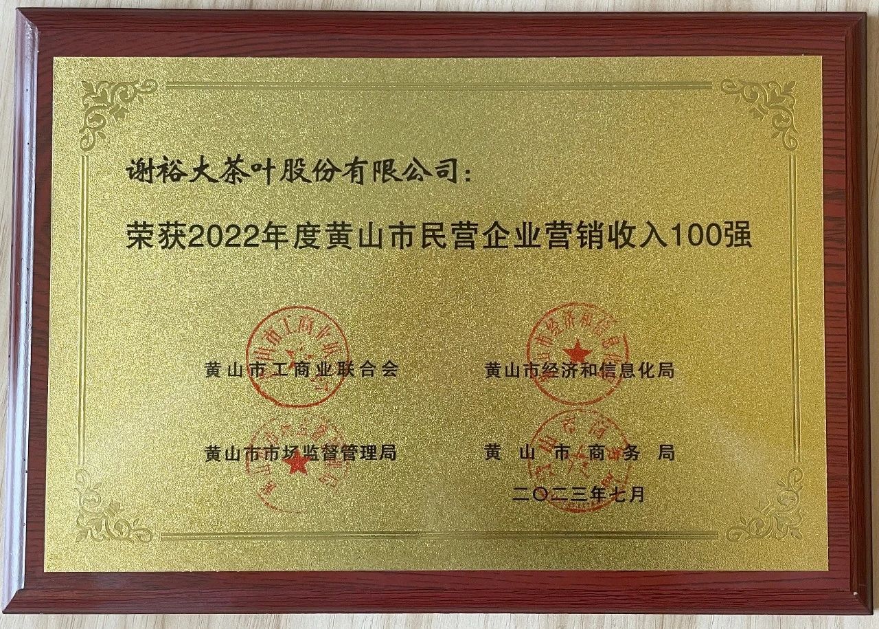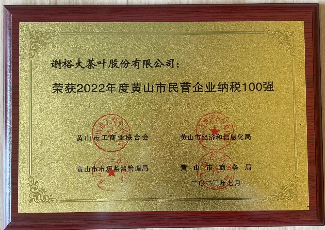 近日,黃山市工商聯(lián)、市經(jīng)信局、市商務(wù)局、市市場(chǎng)監(jiān)督管理局、市統(tǒng)計(jì)局聯(lián)合發(fā)布的2022年度黃山市民營企業(yè)百名排序結(jié)果公布,謝裕大茶葉股份有限公司榮獲2022年度黃山市民營企業(yè)營銷收入100強(qiáng)、2022年度黃山市民營企業(yè)納稅100強(qiáng)雙項(xiàng)榮譽(yù)。