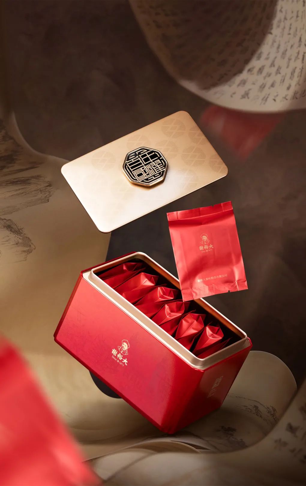 在包裝上,產(chǎn)品提取古代帝皇貴胄視覺符號,以正紅主色調(diào)、立體浮雕、雙層疊燙、古法手繪等工藝打造徽茶高端產(chǎn)品形象,重現(xiàn)黃山毛峰“名震歐洲四五載”之盛景,用視覺探索,從禮鑒徽州到民族品牌的文化自信。