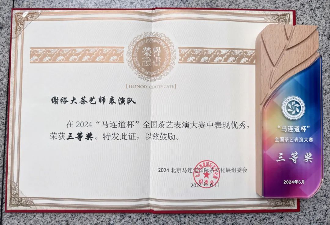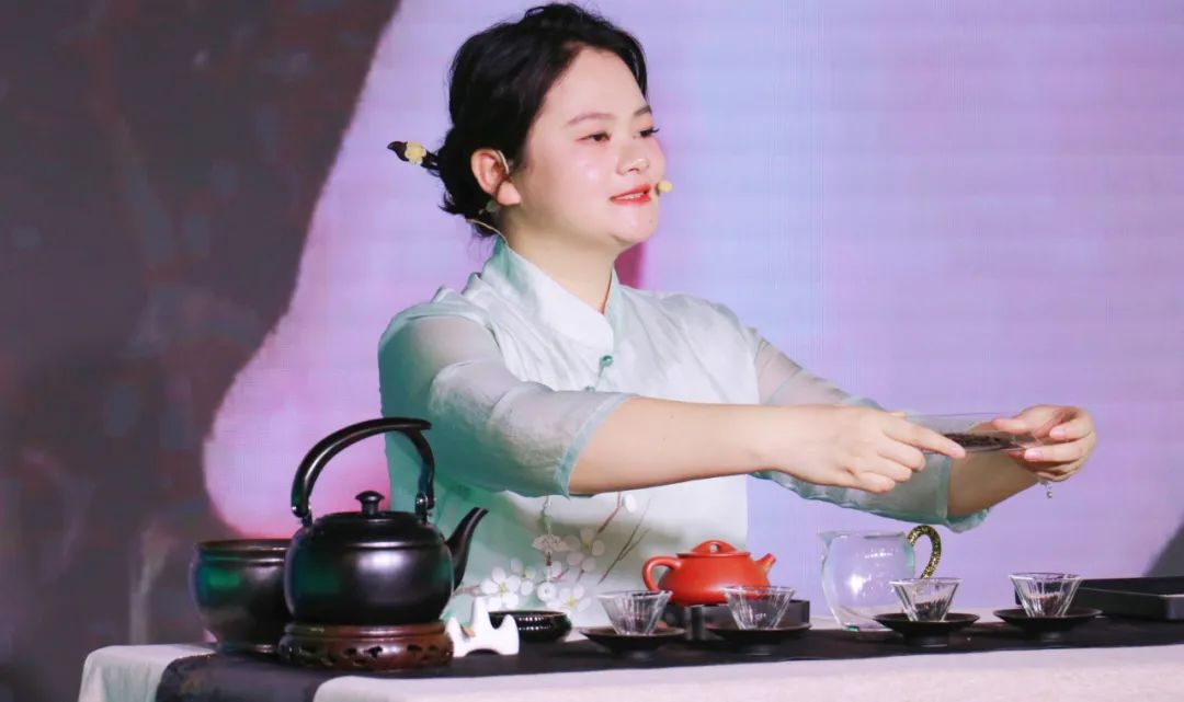 謝裕大茶藝表演劇目《古郡蒼梧,六堡茶鄉(xiāng)》,通過(guò)祝雪蘭在黨的二十大會(huì)議中據(jù)六堡茶發(fā)展向習(xí)總書(shū)記做匯報(bào)工作的故事徐徐展開(kāi),深刻表現(xiàn)出曾經(jīng)幾代茶人的堅(jiān)守與初心,如今茶發(fā)展的欣欣向榮與創(chuàng)新前行,未來(lái)茶產(chǎn)業(yè)的風(fēng)正揚(yáng)帆與廣闊前景。以茶為媒,表達(dá)了當(dāng)代青年茶人對(duì)優(yōu)秀傳統(tǒng)文化的民族自信,榮獲“馬連道杯”全國(guó)茶藝表演大賽三等獎(jiǎng)。