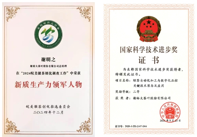 謝明之,作為百年中華老字號(hào)謝裕大的第六代傳人,他不僅繼承了家族的茶業(yè)傳統(tǒng),更以創(chuàng)新精神引領(lǐng)企業(yè)邁向現(xiàn)代化,而企業(yè)發(fā)展的步伐與此份宣言不謀而合。他深知“新質(zhì)生產(chǎn)力”對(duì)產(chǎn)業(yè)發(fā)展的重要性,因此堅(jiān)持“技術(shù)創(chuàng)新”不動(dòng)搖,帶領(lǐng)團(tuán)隊(duì)主導(dǎo)改進(jìn)名優(yōu)茶全程數(shù)控自動(dòng)化加工生產(chǎn)線,參與研制的“綠茶自動(dòng)化加工與數(shù)字化品控關(guān)鍵技術(shù)裝備及應(yīng)用”榮獲2020年度國(guó)家科學(xué)技術(shù)進(jìn)步獎(jiǎng)二等獎(jiǎng),顯著提升了我國(guó)綠茶加工現(xiàn)代化水平和產(chǎn)品國(guó)際競(jìng)爭(zhēng)力,促進(jìn)了茶葉加工向“高效、優(yōu)質(zhì)、節(jié)能、清潔”的技術(shù)轉(zhuǎn)型。